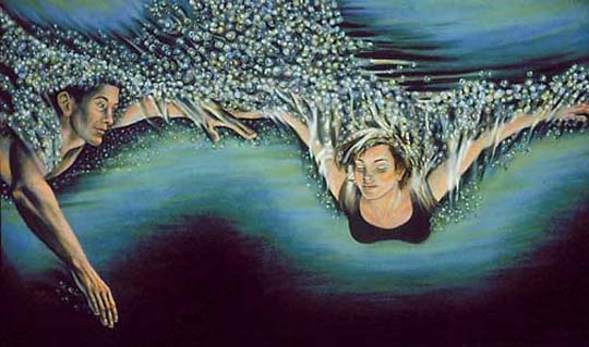 Here a man and woman are meeting under water.