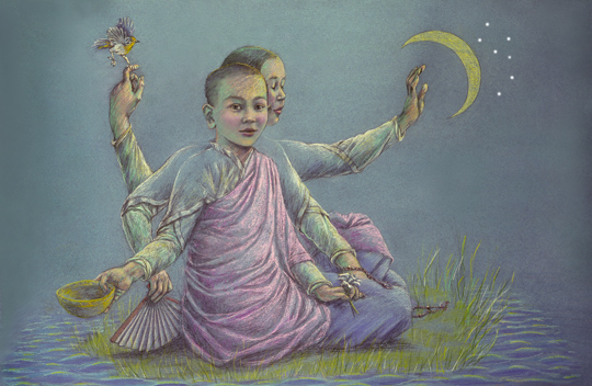 The crescent moon and the begging bowl echo each