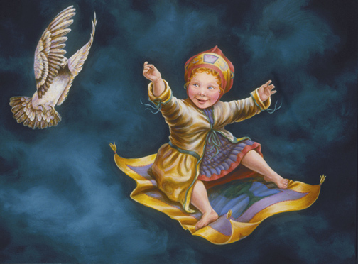 The child on the magic carpet raises its arms